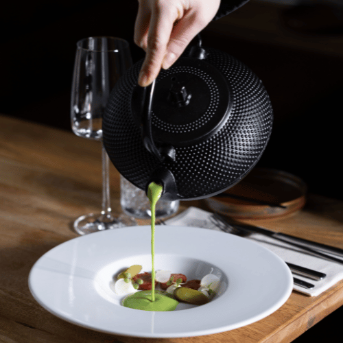 Bij ons draait het om aandacht: voor eten, voor wijn, en voor elkaar. Chef-kok Dirk-Jan kookt elke twee weken een nieuw 5-gangen verrassingsmenu, gebaseerd op wat het seizoen op dat moment te bieden heeft. Vers, creatief en steeds anders.